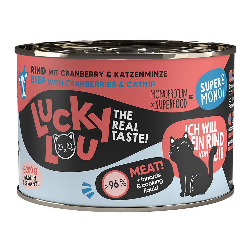 Rind 65 % (bestehend aus Muskelfleisch, Lunge, Herz und Leber), Rindersud 31,4 %, Topinambur 1,5 %, Cranberry 1 %, Mineralstoffe 1 %, Katzenminze 0,1 %